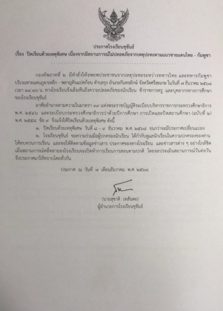 ข่าวประชาสัมพันธ์ ประกาศโรงเรียนขุขันธ์ ประกาศโรงเรียนขุขันธ์ เรื่อง ปิดเรียนด้วยเหตุพิเศษ เนื่องจากมีสถานการณ์ไม่ปลอดภัยจากเหตุปะทะตามแนวชายแดนไทย-กัมพูชา 8 ธันวาคม 20258 ธันวาคม 2025 admin Post Views: 8
